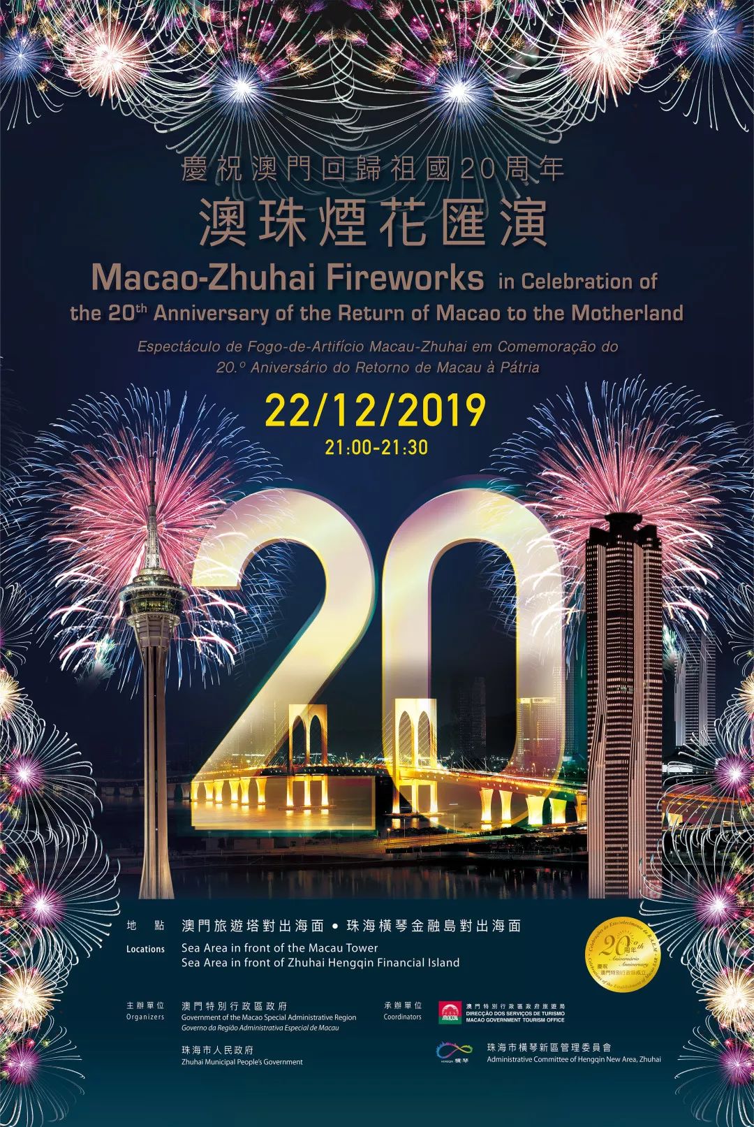“慶祝澳門回歸祖國20周年澳珠煙花匯演”將于12月22日晚上9時,在澳門旅游塔及珠海橫琴金融島對出海面舉行。屆時,4艘大泊船及16個特效燃放平臺于三十分鐘發(fā)放16萬枚煙花,無人船及無人機(jī)亦首次參演。一場壯麗璀璨,寓意團(tuán)圓歡慶、美滿繁盛的煙花盛典將隆重登場!
