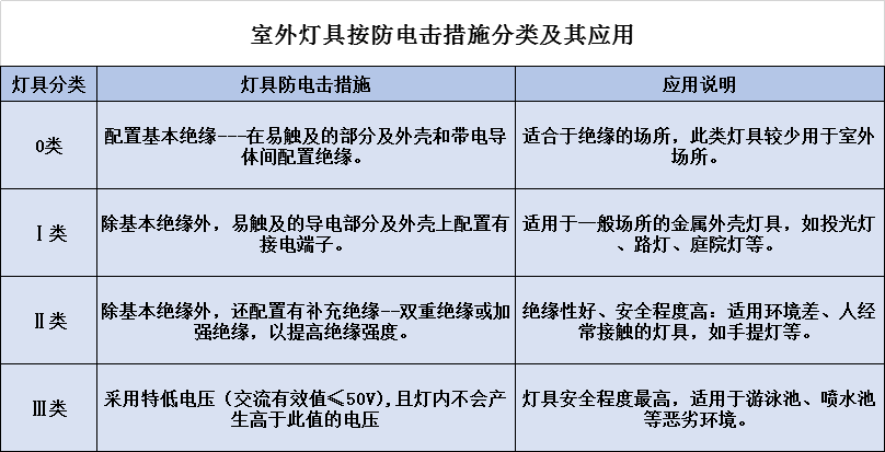 LED戶外燈具按防電擊措施分類及其應用,可參考下表: