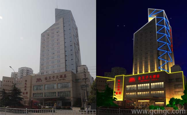 金王子大酒店作為當(dāng)?shù)氐囊蛔貥?biāo)性建筑,酒店方對(duì)亮化這一塊非常重視,亮化方案不能太過(guò)于浮夸、手法不能太重、耗電不能過(guò)大等等,施工方肖總也是方案改了一次又一次,關(guān)于耗電這個(gè)問(wèn)題也就意味著布燈的數(shù)量不能多,盡量少。但是燈具少了布燈的方案要配合好,不然會(huì)影響整體效果。