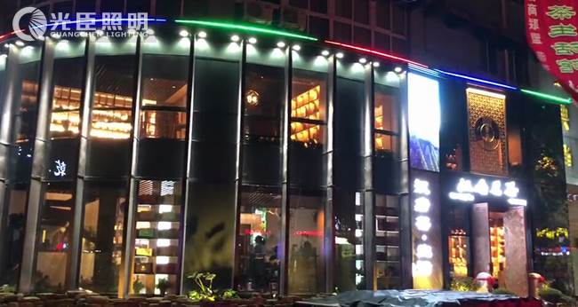 客戶希望做成全彩的效果,因此這里用到的是LED全彩八段線條燈做頂部輪廓,搭配窄光束投射燈對立柱打光,增強(qiáng)立體感,完成了本次亮化。