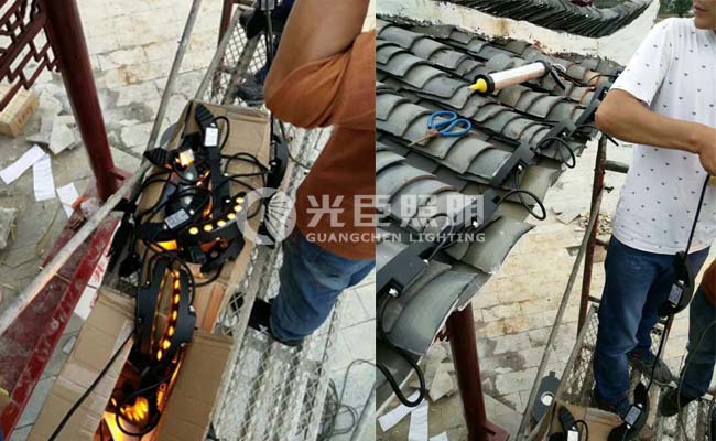 大部份瓦楞燈的安裝都選擇第二種安裝方法。以上是我們貴州的一個旅游景區(qū)在安裝LED瓦楞燈的圖片。工作們把瓦楞燈先串接好后再把鋁片調(diào)整好角度進行粘合。