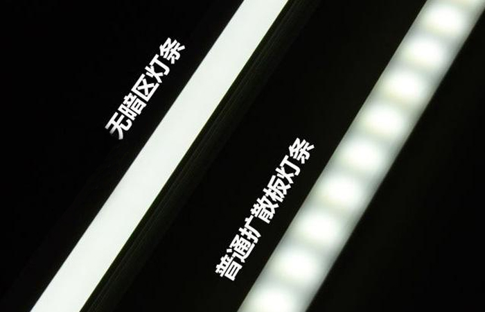 首先,大家來看一下上面這張圖,圖片中我們能了解到LED線條燈有暗區(qū)和無暗區(qū)的區(qū)別,出現(xiàn)暗區(qū)的線條燈光束呈現(xiàn)出點狀形態(tài),無暗區(qū)線條燈的光線十分柔和,原因在于:選用了光擴(kuò)散材料的PC面罩。
